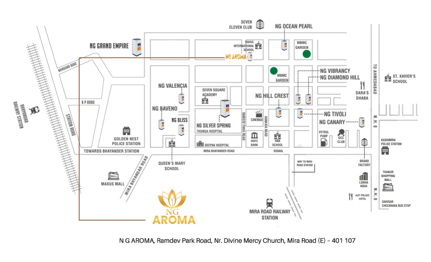 Looking for the perfect space to call home? Look no further than Looking for the perfect space to call home? Look no further than NG AROMA, situated in the prime locality of Mira Road. Our thoughtfully designed edifice offers a wide range of 1 BHK and 2 BHK residential spaces tailored to meet your every need.
